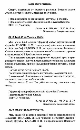Акты вскрытия могил на территории Треблинки I. Акт № 13 от 22 августа 1944 г. // ГАРФ. Ф. Р-7021. Оп. 115. Д. 11. Л. 17. Машинопись. Заверенная копия.