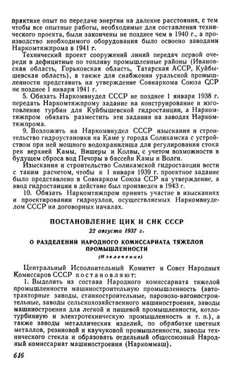 Постановление ЦИК и СНК СССР, 22 августа 1937 г. О разделении Народного комиссариата тяжелой промышленности (Извлечение)