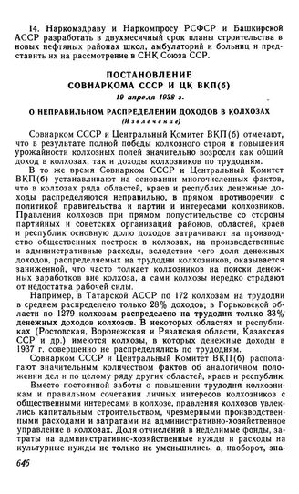 Постановление Совнаркома СССР и ЦК ВКП(б), 19 апреля 1938 г. О неправильном распределении доходов в колхозах (Извлечение)