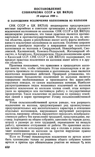 Постановление Совнаркома СССР и ЦК ВКП(б), 19 апреля 1938 г. О запрещении исключения колхозников из колхозов
