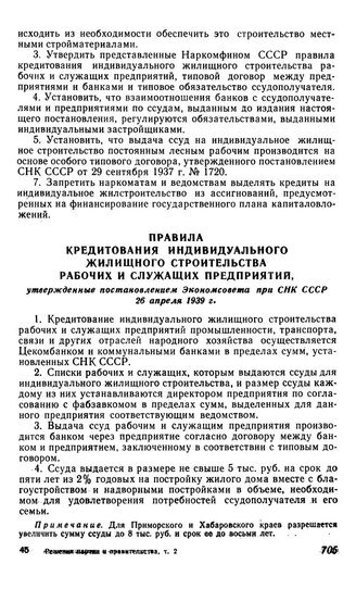 Правила кредитования индивидуального жилищного строительства рабочих и служащих предприятий, утвержденные постановлением Экономсовета при СНК СССР 26 апреля 1939 г