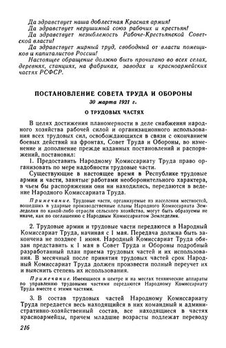 Постановление Совета Tpyдa и Обороны, 30 марта 1921 г. О трудовых частях