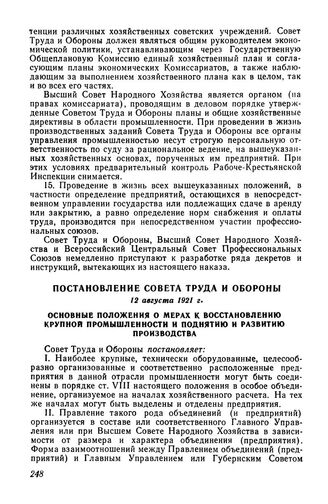 Постановление Совета Труда и Обороны, 12 августа 1921 г. Основные положения о мерах к восстановлению крупной промышленности и поднятию и развитию производства