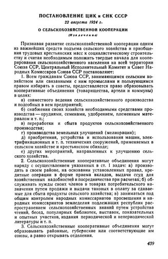 Постановление ЦИК и СНК СССР, 22 августа 1924 г. О сельскохозяйственной кооперации (Извлечение)