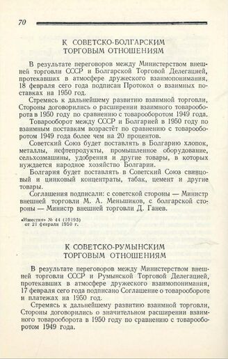 К советско-румынским торговым отношениям // «Известия» № 45 (10194) от 22 февраля 1950 г.