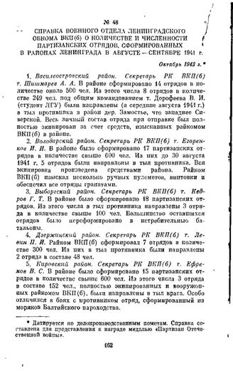 Справка военного отдела Ленинградского обкома ВКП(б) о количестве и численности партизанских отрядов, сформированных в районах Ленинграда в августе — сентябре 1941 г. Октябрь 1943 г.