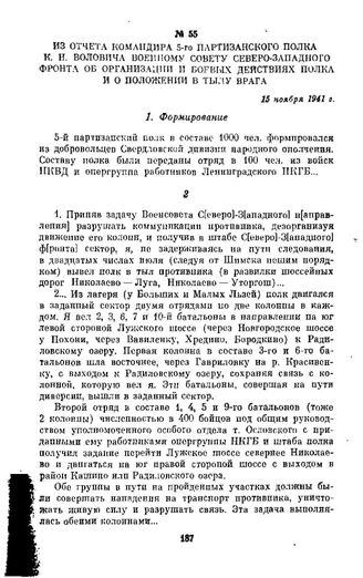 Главная Партизанское движение в годы Великой Отечественной войны В тылу врага. Борьба партизан и подпольщиков на оккупированной терр... В тылу врага. Борьба партизан и подпольщиков на оккупированной терр... Документы Из отчета командира 5-го партизанского полка К. Н. Воловича Военном...