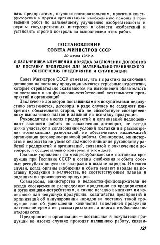 Постановление Совета Министров СССР 30 июня 1962 г. О дальнейшем улучшении порядка заключения договоров на поставку продукции для материально-технического обеспечения предприятий и организаций
