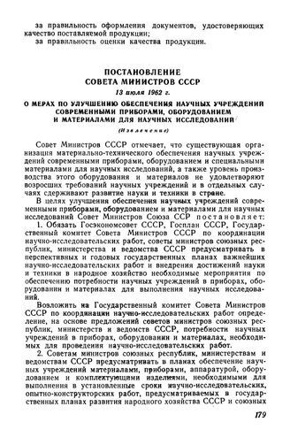 Постановление Совета Министров СССР 13 июля 1962 г. О мерах по улучшению обеспечения научных учреждений современными приборами, оборудованием и материалами для научных исследований (Извлечение)