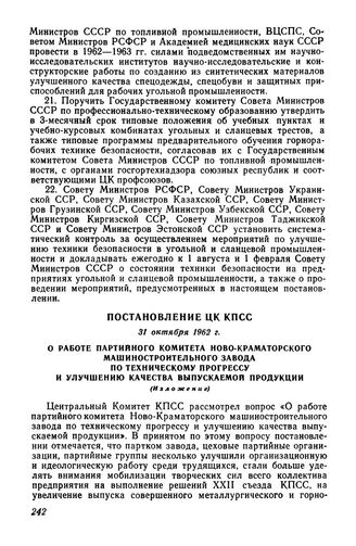 Постановление ЦК КПСС 31 октября 1962 г. О работе партийного комитета Ново-Краматорского машиностроительного завода по техническому прогрессу и улучшению качества выпускаемой продукции (Изложение)