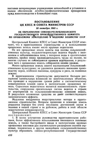 Постановление ЦК КПСС и Совета Министров СССР 25 октября 1963 г. Об образовании союзно-республиканского Государственного производственного комитета по орошаемому земледелию и водному хозяйству СССР