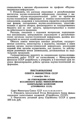 Постановление Совета Министров СССР 1 октября 1964 г. Об утверждении Устава Всесоюзного банка финансирования капитальных вложений (Стройбанка СССР)