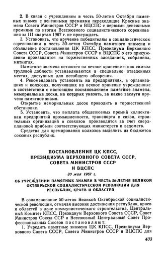 Постановление ЦК КПСС, Президиума Верховного Совета СССР, Совета Министров СССР и ВЦСПС 30 мая 1967 г. Об учреждении памятных знамен в честь 50-летия Великой Октябрьской социалистической революции для республик, краев и областей