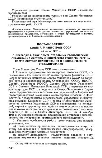 Постановление Совета Министров СССР 14 июля 1967 г. О переводе в виде опыта отдельных геологических организаций системы Министерства геологии СССР на новую систему планирования и экономического стимулирования