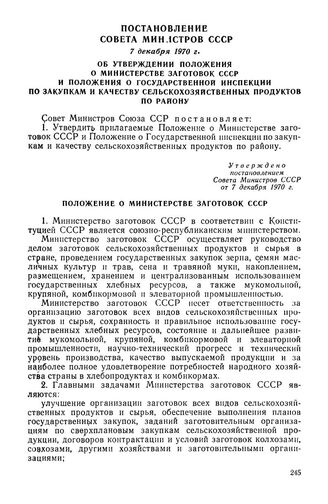 Постановление Совета Министров СССР, 7 декабря 1970 г. Об утверждении Положения о Министерстве заготовок СССР и Положения о Государственной инспекции по закупкам и качеству сельскохозяйственных продуктов по району