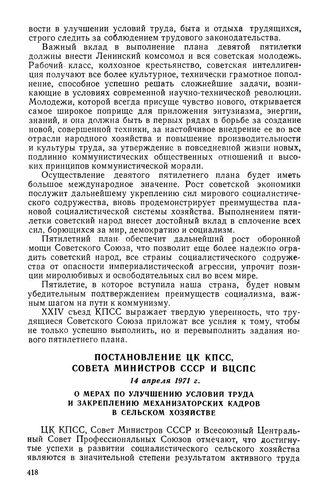 Постановление ЦК КПСС, Совета Министров СССР и ВЦСПС, 14 апреля 1971 г. О мерах по улучшению условий труда и закреплению механизаторских кадров в сельском хозяйстве