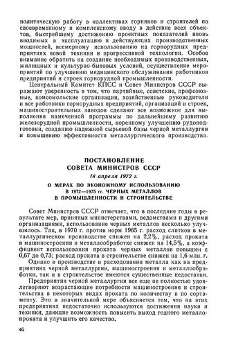 Постановление Совета Министров СССР, 18 апреля 1972 г. О мерах по экономному использованию в 1972-1975 гг. черных металлов в промышленности и строительстве