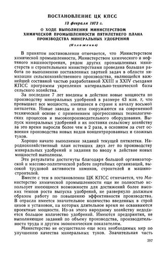 Постановление ЦК КПСС, 13 февраля 1973 г. О ходе выполнения Министерством химической промышленности пятилетнего плана производства минеральных удобрений (Изложение)