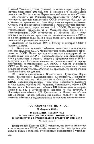 Постановление ЦК КПСС, 22 февраля 1973 г. О серьезных недостатках в организации служебных командировок и излишествах в расходовании средств на эти цели (Извлечение)