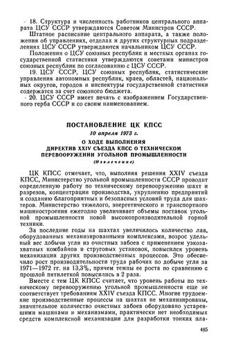 Постановление ЦК КПСС, 10 апреля 1973 г. О ходе выполнения Директив XXIV съезда КПСС о техническом перевооружении угольной промышленности (Извлечение)
