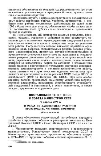 Постановление ЦК КПСС и Совета Министров СССР, 10 апреля 1973 г. О мерах по дальнейшему развитию производства чугунных тюбингов (Извлечение)