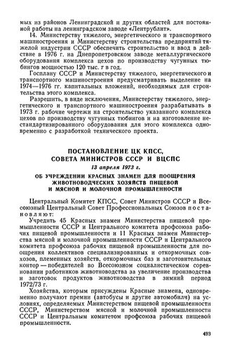 Постановление ЦК КПСС, Совета Министров СССР и ВЦСПС, 13 апреля 1973 г. Об учреждении Красных знамен для поощрения животноводческих хозяйств пищевой и мясной и молочной промышленности