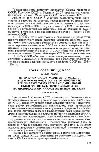 Постановление ЦК КПСС, 28 мая 1973 г. Об организаторской работе Белгородского и Курского обкомов партии по выполнению решений XXIV съезда КПСС о создании новой железорудной базы черной металлургии на месторождениях Курской магнитной аномалии (Извлечение)