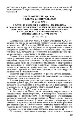 Постановление ЦК КПСС и Совета Министров СССР, 27 июля 1973 г. О мерах по ускорению развития производства и повышению технического уровня средств механизации подъемно-транспортных, погрузочно-разгрузочных и складских работ в промышленности, строительстве и на транспорте (Извлечение)