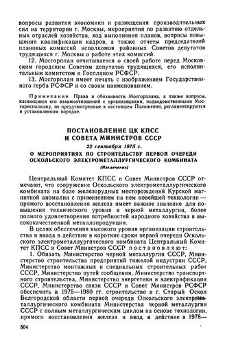 Постановление ЦК КПСС и Совета Министров СССР, 22 сентября 1975 г. О мероприятиях по строительству первой очереди Оскольского электрометаллургического комбината (Извлечение)