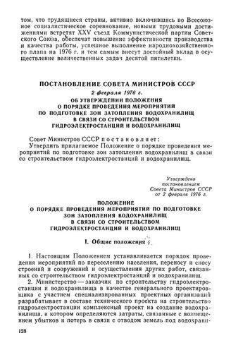 Постановление Совета Министров СССР, 2 февраля 1976 г. Об утверждении Положения о порядке проведения мероприятий по подготовке зон затопления водохранилищ в связи со строительством гидроэлектростанций и водохранилищ