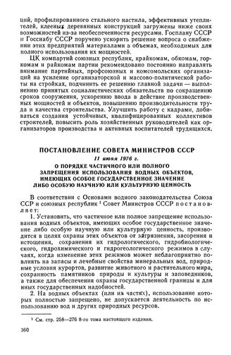 Постановление Совета Министров СССР, 11 июня 1976 г. О порядке частичного или полного запрещения использования водных объектов, имеющих особое государственное значение либо особую научную или культурную ценность