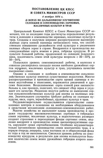 Постановление ЦК КПСС и Совета Министров СССР, 4 ноября 1976 г. О мерах по дальнейшему улучшению селекции и семеноводства зерновых, масличных культур и трав