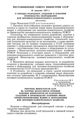 Постановление Совета Министров СССР, 19 августа 1977 г. О порядке разработки, создания и освоения производства оборудования для жилищно-коммунального хозяйства (Извлечение)