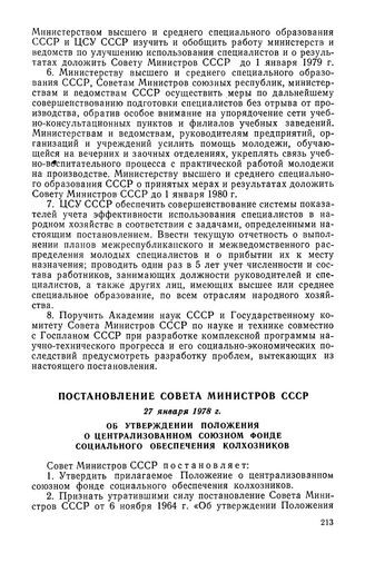 Постановление Совета Министров СССР, 27 января 1978 г. Об утверждении Положения о централизованном союзном фонде социального обеспечения колхозников