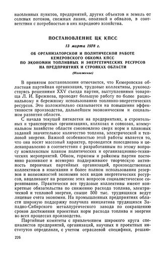 Постановление ЦК КПСС, 13 марта 1978 г. Об организаторской и политической работе Кемеровского обкома КПСС по экономии топливных и энергетических ресурсов на предприятиях и стройках области (Изложение)
