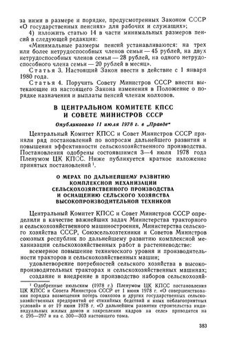 В Центральном Комитете КПСС и Совете Министров СССР. О мерах по дальнейшему развитию комплексной механизации сельскохозяйственного производства и оснащению сельского хозяйства высокопроизводительной техникой // Опубликовано 11 июля 1978 г. в «Правде».