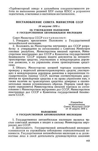 Постановление Совета Министров СССР, 10 августа 1978 г. Об утверждении Положения о государственной автомобильной инспекции