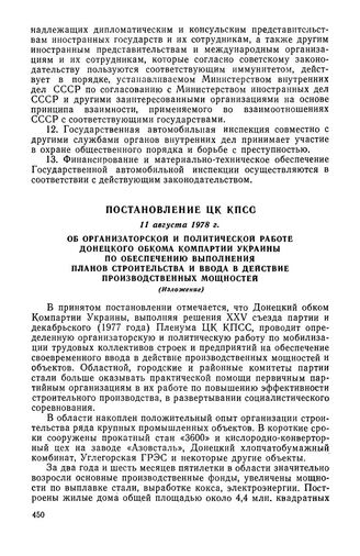 Постановление ЦК КПСС, 11 августа 1978 г. Об организаторской и политической работе Донецкого обкома Компартии Украины по обеспечению выполнения планов строительства и ввода в действие производственных мощностей (Изложение)