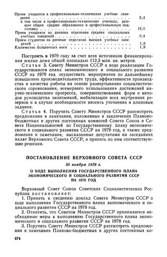 Постановление Верховного Совета СССР, 30 ноября 1978 г. О ходе выполнения Государственного плана экономического и социального развития СССР на 1978 год