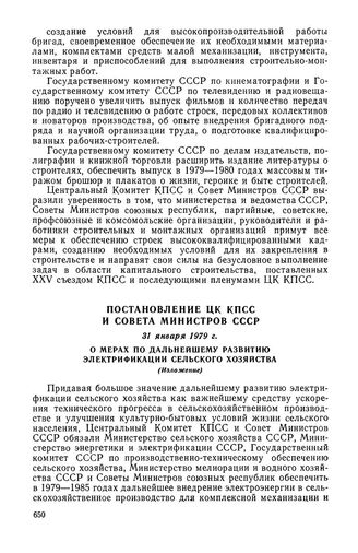 Постановление ЦК КПСС и Совета Министров СССР, 31 января 1979 г. О мерах по дальнейшему развитию электрификации сельского хозяйства (Изложение)