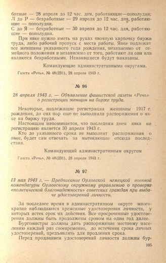 Предписание Орловской немецкой военной комендатуры Орловскому окружному управлению о проверке «политической благонадежности» советских граждан при выдаче удостоверений личности. 13 мая 1943 г. // ГАОО, ф. 294, д. 2, л. 121. Подлинник. Перевод с немецкого.