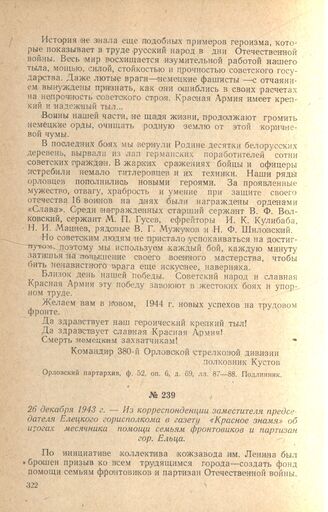 Из корреспонденции заместителя председателя Елецкого горисполкома в газету «Красное знамя» об итогах месячника помощи семьям фронтовиков и партизан гор. Ельца. 26 декабря 1943 г.
