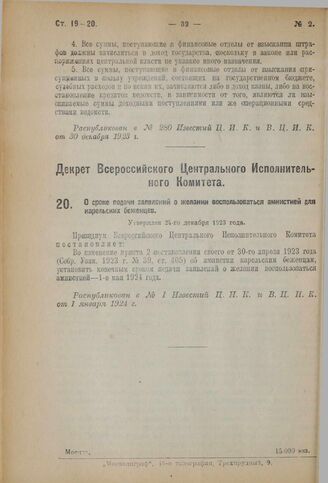 Декрет Всероссийского Центрального Исполнительного Комитета. О сроке подачи заявлений о желании воспользоваться амнистией для карельских беженцев. Утвержден 24-го декабря 1923 года