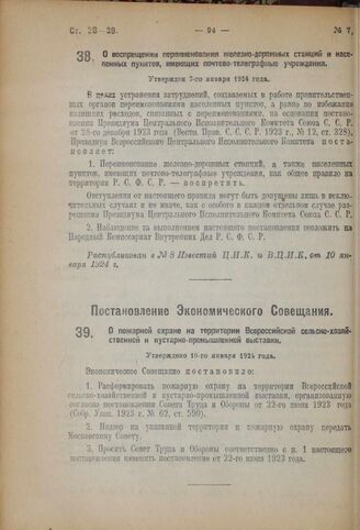 Постановление Экономического Совещания. О пожарной охране на территории Всероссийской сельско-хозяйственной и кустарно-промышленной выставки. Утверждено 10-го января 1924 года