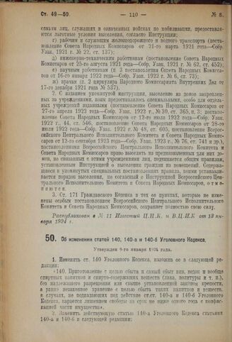 Декрет Всероссийского Центрального Исполнительного Комитета и Совета Народных Комиссаров. Об изменении статей 140, 140-а и 140-6 Уголовного Кодекса. Утвержден 9-го января 1924 года