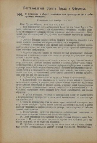 Постановление Совета Труда и Обороны. О пошлинах и сборах, взимаемых при производстве дел в арбитражных комиссиях. Утверждено 3-го декабря 1923 года