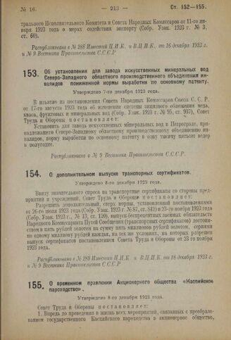 Постановление Совета Труда и Обороны. Об установлении для завода искусственных минеральных вод Северо-Западного областного производственного объединения инвалидов пониженной нормы выработки по основному патенту. Утверждено 7-го декабря 1923 года // Распубликовано в № 9 Вестника Правительства С.С.С.Р.