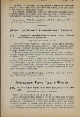 Постановление Совета Труда и Обороны. Об установлении тарифа на перевозку донецкого угля на Петроград. Утверждено 28-го декабря 1923 года // Распубликовано в № 5 Известий Ц.И.К. и В.Ц.И.К. от 6 января 1924 г. и № 12 Вестника Правительства С.С.С.Р.