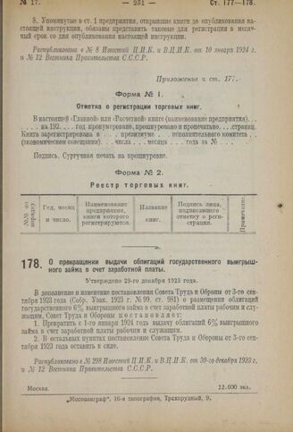 Постановление Совета Труда и Обороны. О прекращении выдачи облигаций государственного выигрышного займа в счет заработной платы. Утверждено 29-го декабря 1923 года