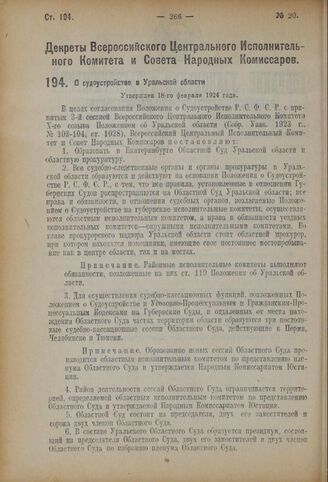 Декрет Всероссийского Центрального Исполнительного Комитета и Совета Народных Комиссаров. О судоустройстве в Уральской области. Утвержден 18-го февраля 1924 года // Распубликован в № 48 Известий Ц.И.К. и В.Ц.И.K. от 27 февраля 1924 г.